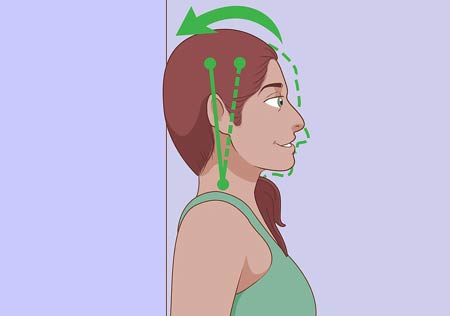 فرض کنید که نواری از پایه گردن تا بالای سرتان کشیده شده است. نوار را از بالا بکشید تا گردنتان بلندتر شود. همان طور که پشت گردن بلندتر میشود، چانه باید رو به داخل و پایین به سمت پشت گردن جمع شود. این حالت همان وضعیت صحیح سر و گردن است. دقت کنید که نباید صرفاً سر را عقب ببرید و قوس گردن را زیاد کنید. چنین وضعیتی اشتباه است. هدف افزایش طول پشت گردن است.